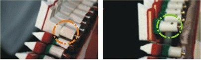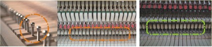 *威士頓鋼琴鍵盤在卡釘接口處,中稍釘上下接口處,均加接硬木,以防止因轉動引起的關鍵部位木質變形,造成轉動的滯緩;普通鋼琴則只有中稍釘上側有加接硬木。