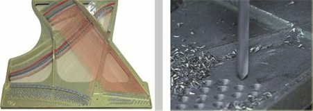 *鐵板又稱鐵骨。無論是臥式鋼琴還是立式鋼琴,其鐵板的制作都是最為重要和關鍵的。鐵板是琴弦張力的載體,承擔者來自琴弦的全部張力,是整架鋼琴的重要支撐架。制造鐵板最好的材料是鑄鐵。威士頓鋼琴鐵板全部選用最上等的優質鑄鐵,結合現代最新技術,融入先進的鑄造和加工工藝,鑄造而成金黃色鐵架。高品質的鑄鐵令鐵板具有強耐性,并能穩健的承受琴弦的張力。再使用數控設備精確鉆孔,使琴弦排列準確,到位。