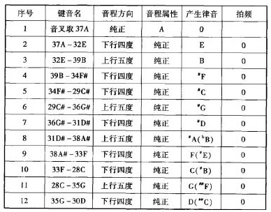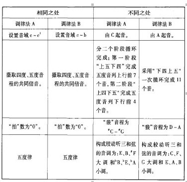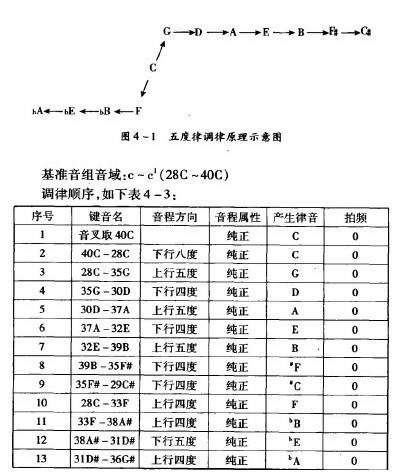 接上文,下面就是“畢達哥拉斯調律法”的二種方法的調律順序作簡單介紹。 一、C起音調律法(以下簡稱“調律法A) 此方法以五度律產生法為原理,從主音C起向上連續取七律和向下連續取四律,就構成一完整音階,如下圖 此調律法分二個階段進行。第一階段1 -9步,為上五下四生律法;產生五度律C音上行的7個音。這個階段的“下四”產生的律音,實為四度音程上方音上行五度產生的律音,下移一個八度。即:左圖 第二階段10-13步,為上四下五生律法;產生五度音列C下行的4個音。這個階段的“上四”產生的律音,實為四度音程下方音下行五度產生的律音。上移一個八度。即:右圖 這種調律法產生的音律,幾乎所有的五度音程都為純正音程(702音分),無拍,唯有由二個階段最后一步產生的音構成的五度音程,即,'C一“A為“狼”(wolf)音程。此五度音在聽覺感受上十分不和諧,有相當數量的“拍”。因為,它要比其它的五度音程(702音分)低了24音分,只有678音分。其次,多數大三度音程為408音分,要比純正音程(386音分)高出22音分,故在聽覺上也十分不和諧。只有B一“E,憶一F,E一“A,勺一“B四個大三度音程是384音分,接近純正音程(386音分),因此感覺上稍為和諧一些。由此,這一調律法產生的音律,能夠構成較優美的三和弦.只有E大調、B大調、勺大調、6B小調、生小調和‘A小調。 為了獲得既能構成優美和弦,又是常用音調的五度律。于是,出現了以A音起音的“下四上五循環調律法”(以下簡稱“調律法B”)。 二、A音起音的“下四上五循環調律法”(以下簡稱“調律法B“)基準音組音域:c一b (28C一39B)調律順序如下表 A音開始的調律法與前一種方法一樣,產生的音律所構成的五度音程絕大多數是純正音程,無拍,唯有起初的音與最后產生的音構成的五度音程(D一A)為“狼”音。這時,有G一B,C一E,D一#F和F一A四個大三度音程為384音分,接近純正音程。由此,產生了能夠構成較優美三和弦,常用的C,F,G三個大調以及E,A,B三個小調。 以上可以看出,雖然這二種“畢達哥拉斯調律法”其工作原理一樣,產生的都是“五度律”,但它們還是有一些區別的地方。其異同如上表。 |