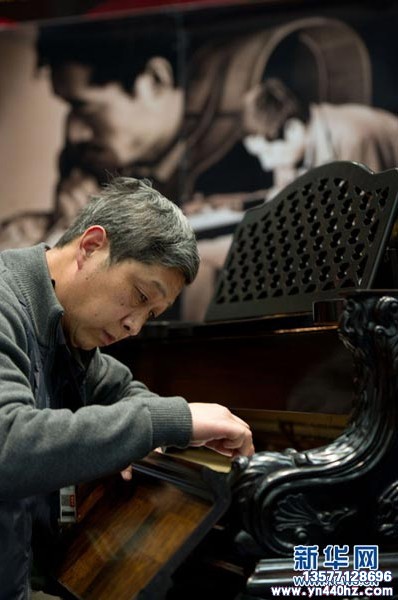 中國南京鋼琴制作師張綱寧正在展會(huì)上調(diào)試鋼琴