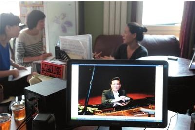 6月27日,楊彬在家中接受本報記者專訪,電腦屏幕上是吳龍的演出照。本報記者攝